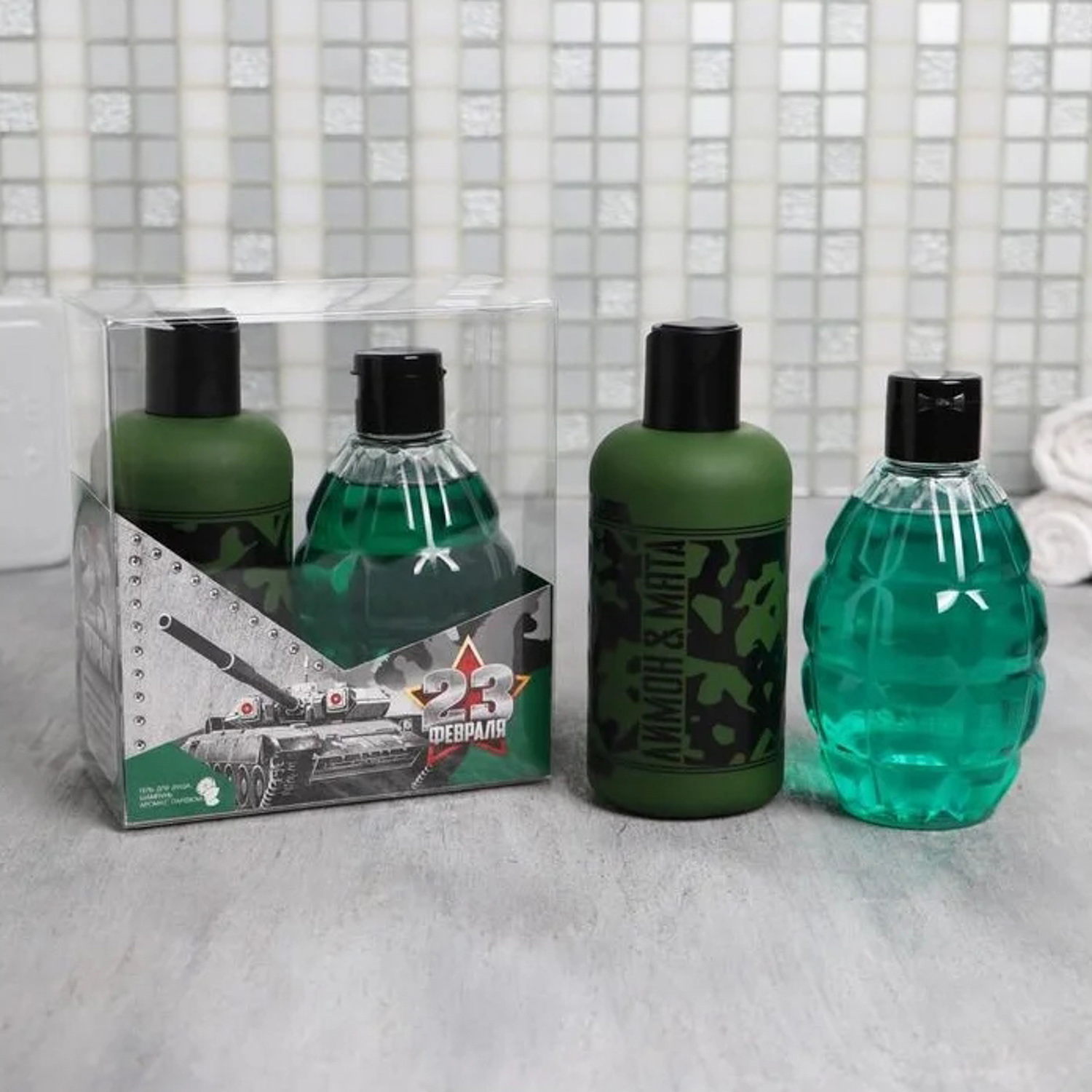 яяяНабор "23 Февраля танк" гель для душа фляга, шампунь граната 250 мл аромат мята и цитрус 4569174