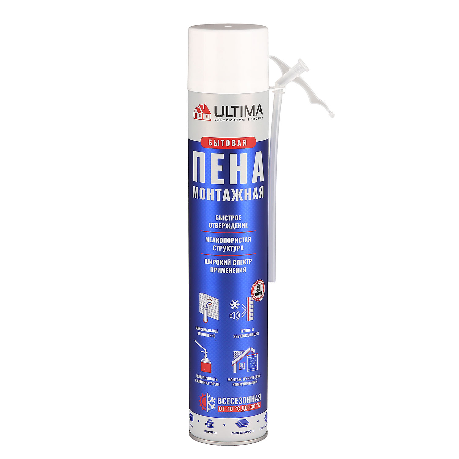 Пена монтажная бытовая ULTIMA всесезонная 1000 мл предназначена для разового запенивания пустот, швов, тепло- и звукоизоляции, монтажа технических коммуникаций, установки, герметизации и фиксации изоляционных и утеплительных материалов на стенах.