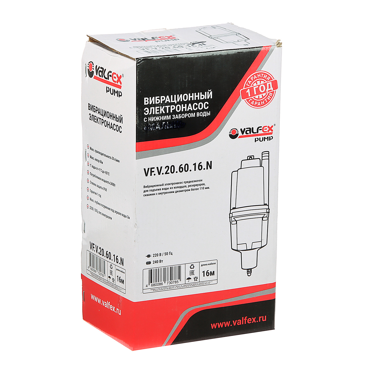 Насос погружной вибрационный нижн.забор шнур16м 240Вт 1200л/час напор60м 20/60-16м VALFEX
