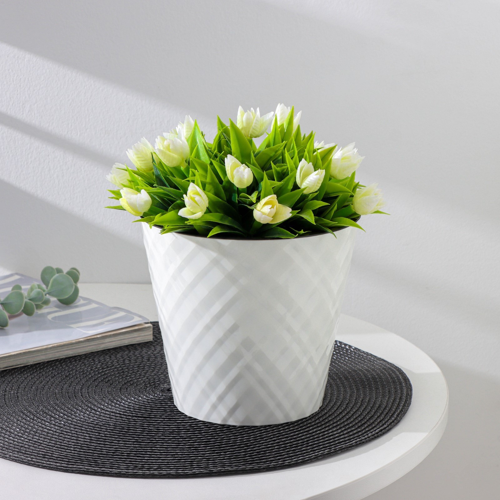 штПоверхность кашпо выполнена вертикальными волнами, сформированными по модели пустынного песка. Горшок укомплектован вкладышем для регулировки в нём воды. Между горшком и вкладышем есть пространство для воды, которая используется растениями при необходимости. Преимущества вкладыша: не нужен поддон, нет необходимости часто поливать цветы, корешки не подвергаются гниению. Материал устойчив к солнечному свету, низким температурам и механическим повреждениям. Кашпо выполнены в природных оттенках: белый, кремовый, серый. Является неповторимой деталью способной украсить и оживить интерьер любого дома.