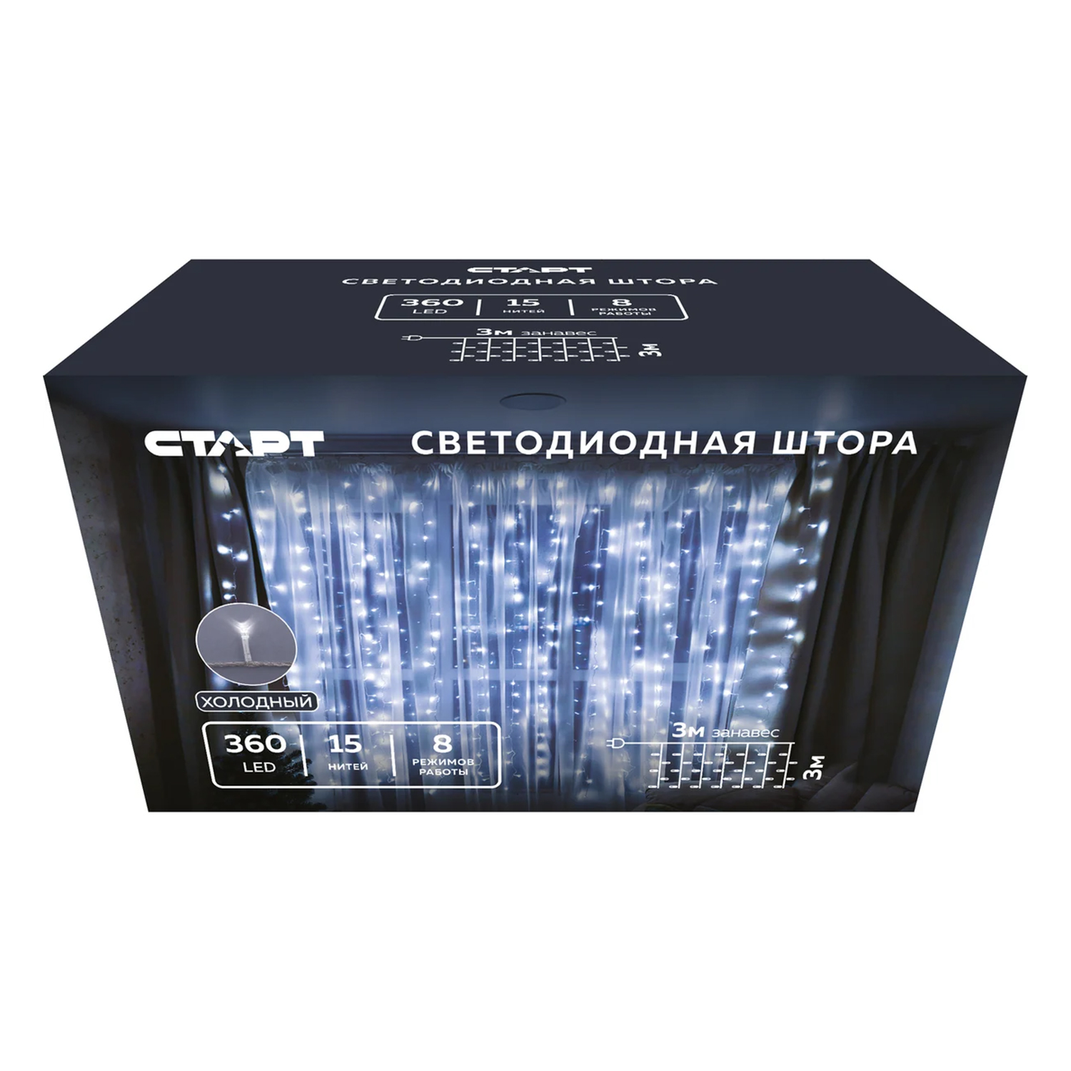 Гирлянда «Занавес» Старт, 3х3 м, 8 режимов, белый, 360 LED, 220 В