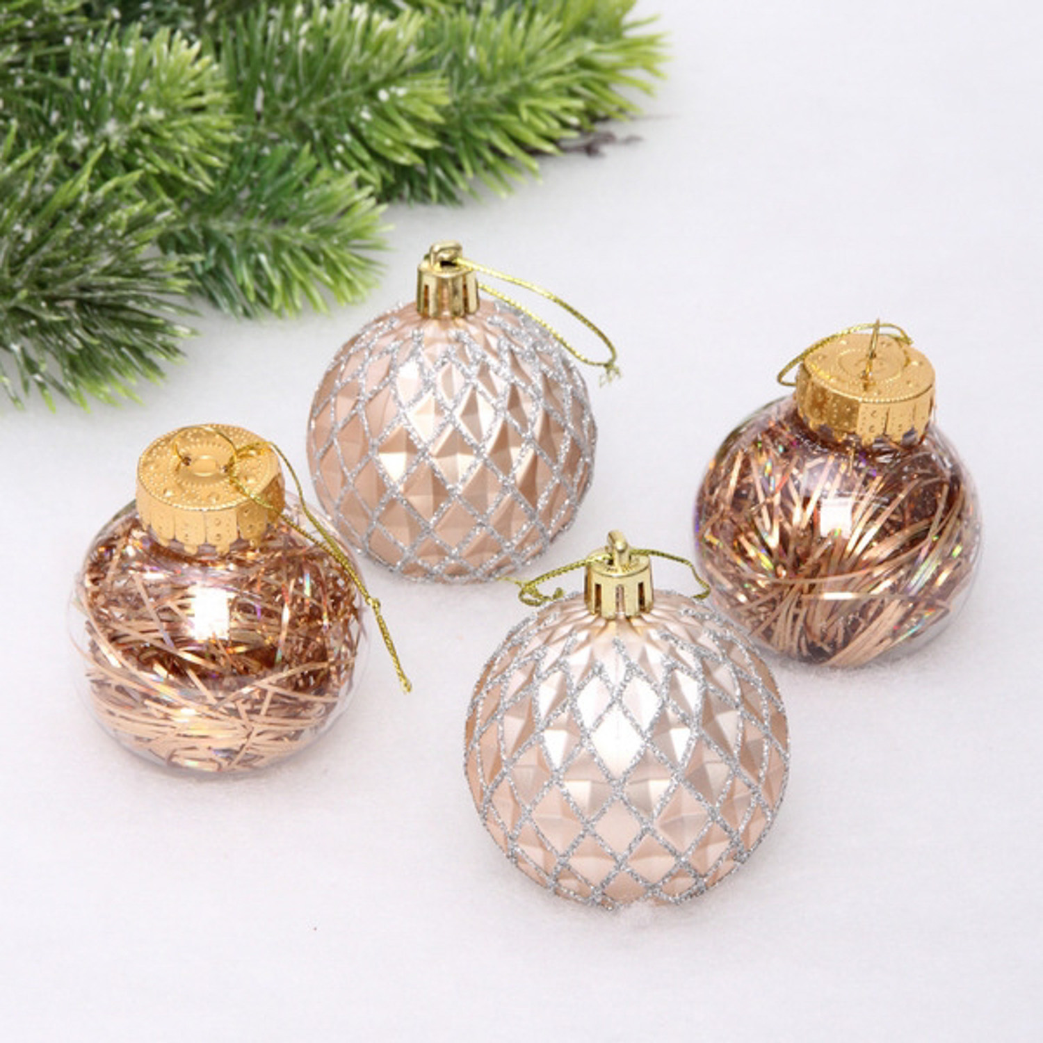 Новогодние шары 6 см (набор 4 шт) "Яркая метель", шампань/серебро